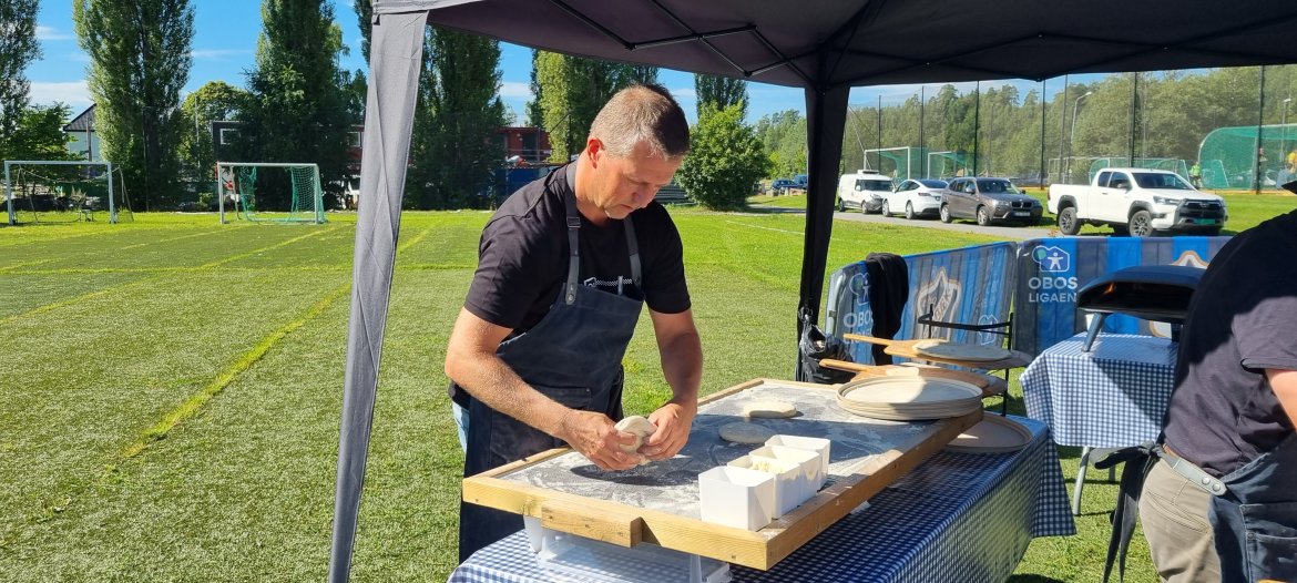 - Vi lager vel 250 pizzaer her i dag. Så da må vi trå til selv også, smiler Per, som viste at han hadde bra håndlag med pizzadeigen i det han snurret den ut før den forsvant til neste bord der Anders, et par kolleger og neon i familien stod klare for å ta på fyll og ingredienser før den forsvant inn i gassovnen.