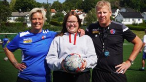 Statsministeren smilte om kapp med sola - før hun tok et treffsikkert avspark for Fotballstiftelsens 25. gatelag. Bodø/Glimt.
